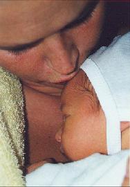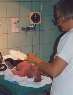 | Tirsdag aften var veerne taget til i styrke, og kl. 22:25 gik vandet. Kl. 05:00 var vi på fødegangen på Gentofte hospital og kl. 11:50, onsdag d. 11-11-1998 fødte Annika en 54 cm lang dreng, som vejede 3.450 gram. Jubiiii ... Der var bare et lille men: Det forløsende skrig man normalt hører i sekunderne efter fødslen kom aldrig. |