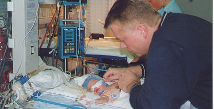 | Kaspar blev fjernet fra mors mave og lagt på et undersøgelsesbord, hvor han blev suget i næse, mund og luftveje. Stadig intet skrig. Så begyndte alvoren at gå op for os. Jeg blev bedt om at give ilt med en håndventilator (og det gjorde jeg naturligvis) mens Kaspar blev suget endnu engang. Der blev tilkaldt en børnelæge, som selv havde flere eksperter med sig, og de begyndte alle at undersøge Kaspar. I alt stod der nu ca. 10 hvide kitler omkring vores lille søn, I kan selv forsøge at forestille jer, hvad man, som nybagte forældre, tænker i den situation - ikke rare tanker kan jeg forsikre jer om! |