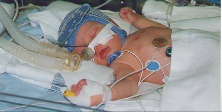 | På Rigshospitalet var gensynet med Kaspar yderligere belastende for vores i forvejen hårdt prøvede psyke. Han var ikke taget ud af respiratoren, og de førnævnte maskiner med de enerverende alarmer var der også endnu. Lægerne og sygeplejeskerne modtog os med noget der lignede en diagnose; i fostertilværelsen iltes blodet gennem moderkage og navlestreng og ved en normal fødsel lukkes blodet så ud i lungerne, som så overtager funktionen. Smart nok, Kaspar havde bare "glemt", at han ikke længere lå i mors mave, og forsøgte derfor stadig at ilte blodet gennem moderkage og navlestreng, og ikke i lungerne. Det var årsagen til, at han stadig lå i respirator. Han skulle i "terapi", eller opdrages til at trække vejret selv, og hvordan gør man det bedre end ved at vise ham det på egen krop? |